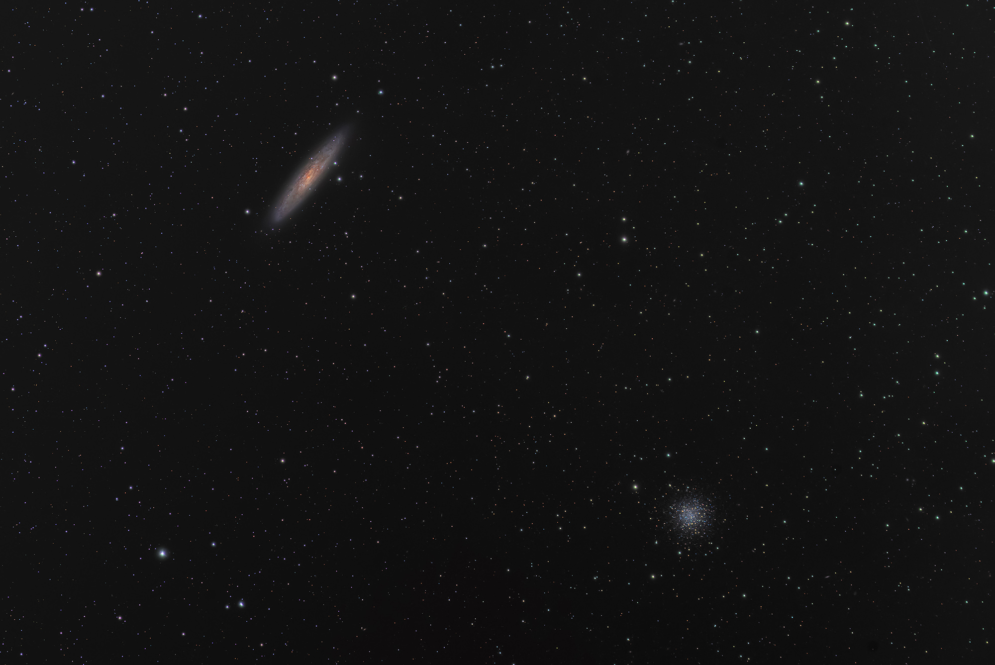 Ritkán együtt fényképezett NGC253 Ezüstdollár-galaxis és NGC288 gömbhalmaz páros a Sculptorban.