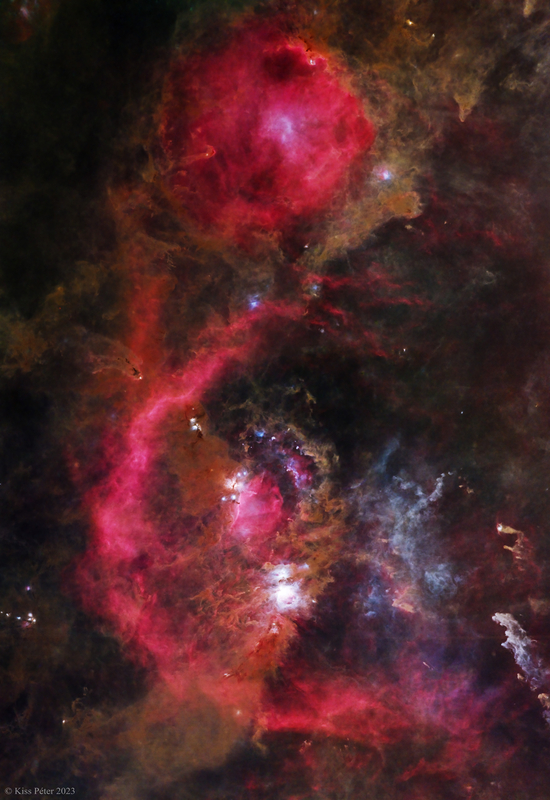 Évekkel ezelőtt megfogalmazódott bennem, hogy milyen jó lenne a teljes Orion csillagképet lefotózni, és 2022 januárjában sikerült összehozni a 4 paneles mozaikot a Samyang 135mm-es obival. A feldolgozás kicsit elhúzódott, elsősorban a rendkívül sűrű csillagmező miatt. Miután a nyersek RGB-ben lettek rögzítve nem pedig keskenysávban, a csillagmező teljes spektrumban tündökölt, ezért a háttér kiemelése eléggé problémás volt. Az áttörést a Starnet2 hozta. Ezzel a programmal sikerült a csillagokat nagyon szépen eltávolítani a képről, így lehetőség nyílt a háttér és a csillagok külön kezelésére. A Starnet2 tényleg megdöbbentően jó munkát végzett! A kép nem teljesen hiteles, hiszen a csillagmezőt valamivel helyettesíteni kellett, és a csillagok nem olyan mértékben lettek felgörbézve mint a háttér. Feltöltöttem a csillag nélküli verziót is, mert én szeretek bóklászni ezen a képen is.