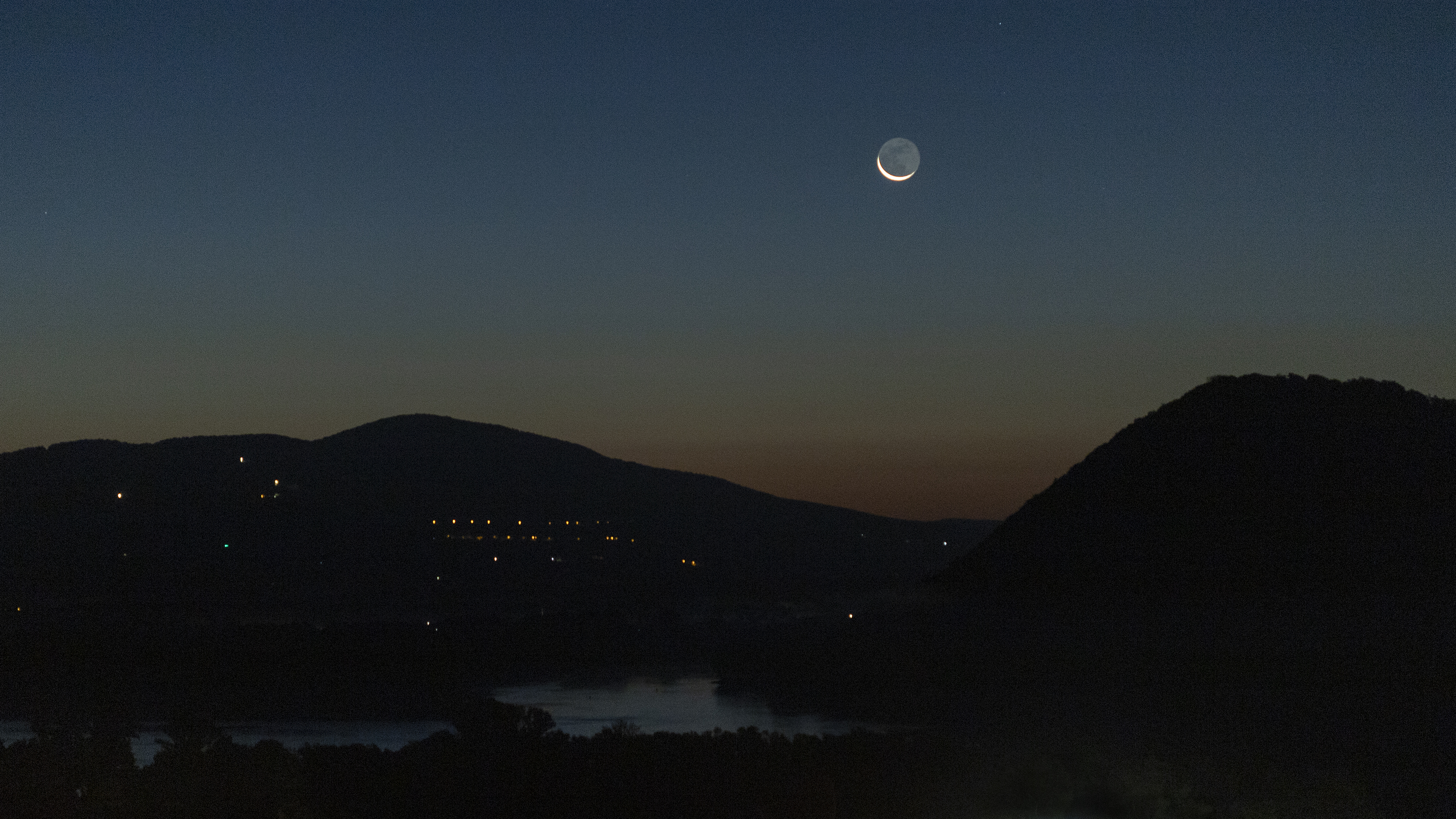 A ma hajnali 39 órás holdsarló Nagymarosról fotózva a Duna és a Visegrádi-hegység felett.