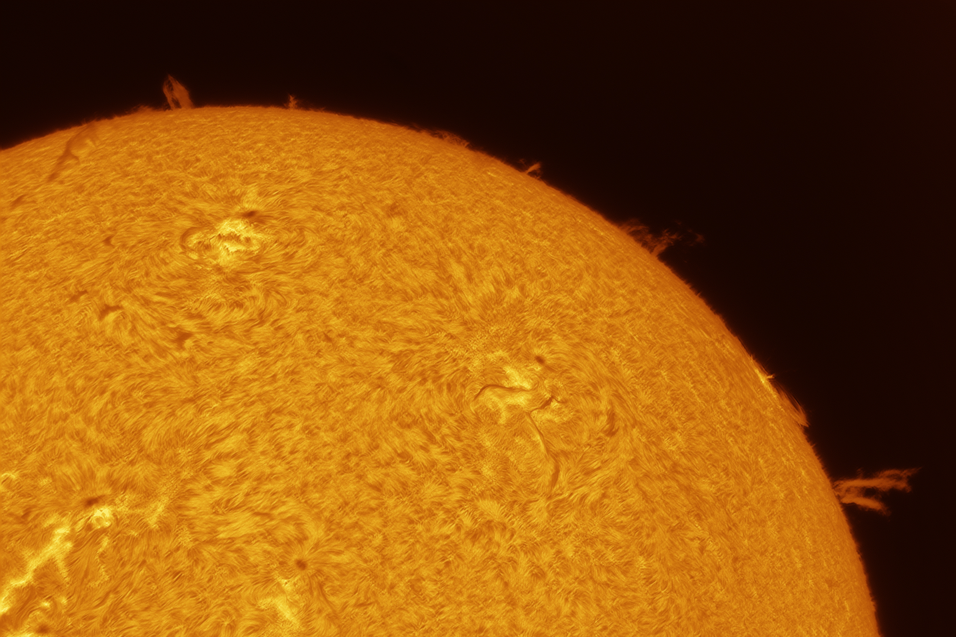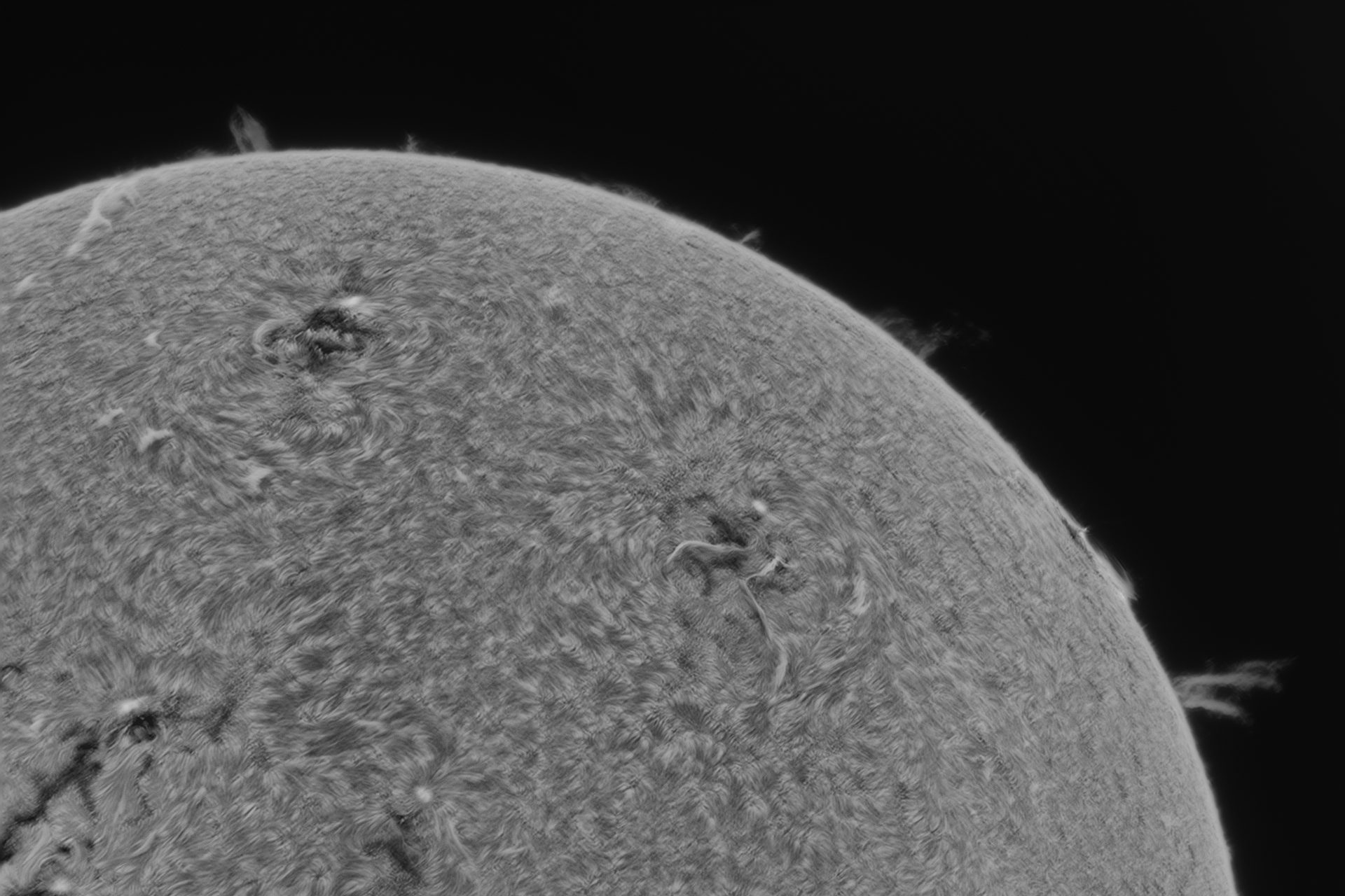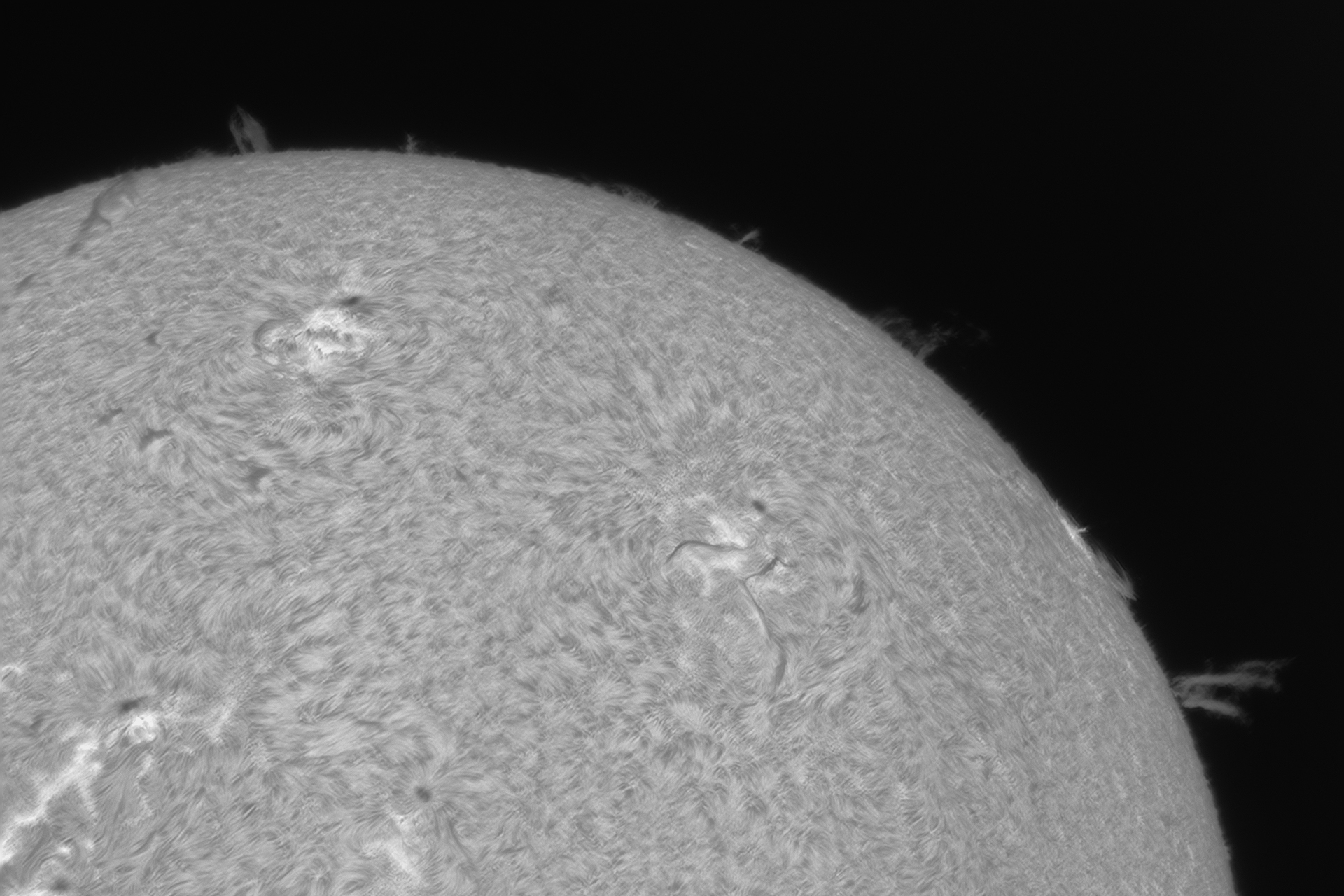A derült időjárást kihasználva kitelepültem az erkélyemre és készítettem néhány felvételt a Napról, ezúttal egy kétszeres nagyítású fókusznyújtóval és az új monokróm kamerámmal. Jópár protuberancia, napfolt, filament is látható a felvételen.