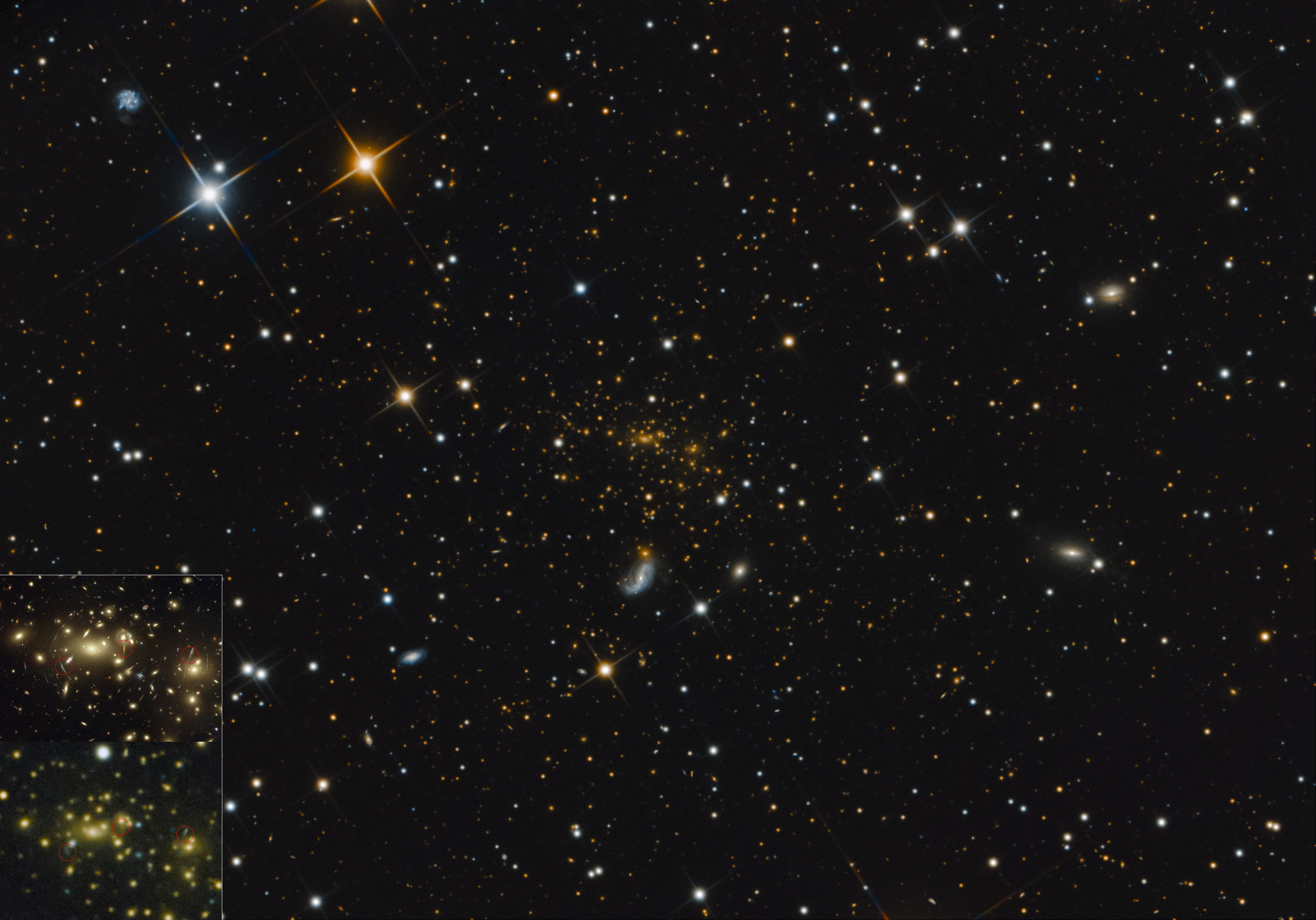 A halmaz hatalmas tömege – amelynek nagy részét sötét anyag alkotja – jelentősen meggörbíti maga körül a téridőt, az általános relativitáselmélet előrejelzése szerint. Ez a görbült téridő fókuszálja és elhajlítja a mögötte lévő, még távolabbi objektumok (például fiatal galaxisok) fényét. Ezt a jelenséget nevezzük gravitációs lencsehatásnak.