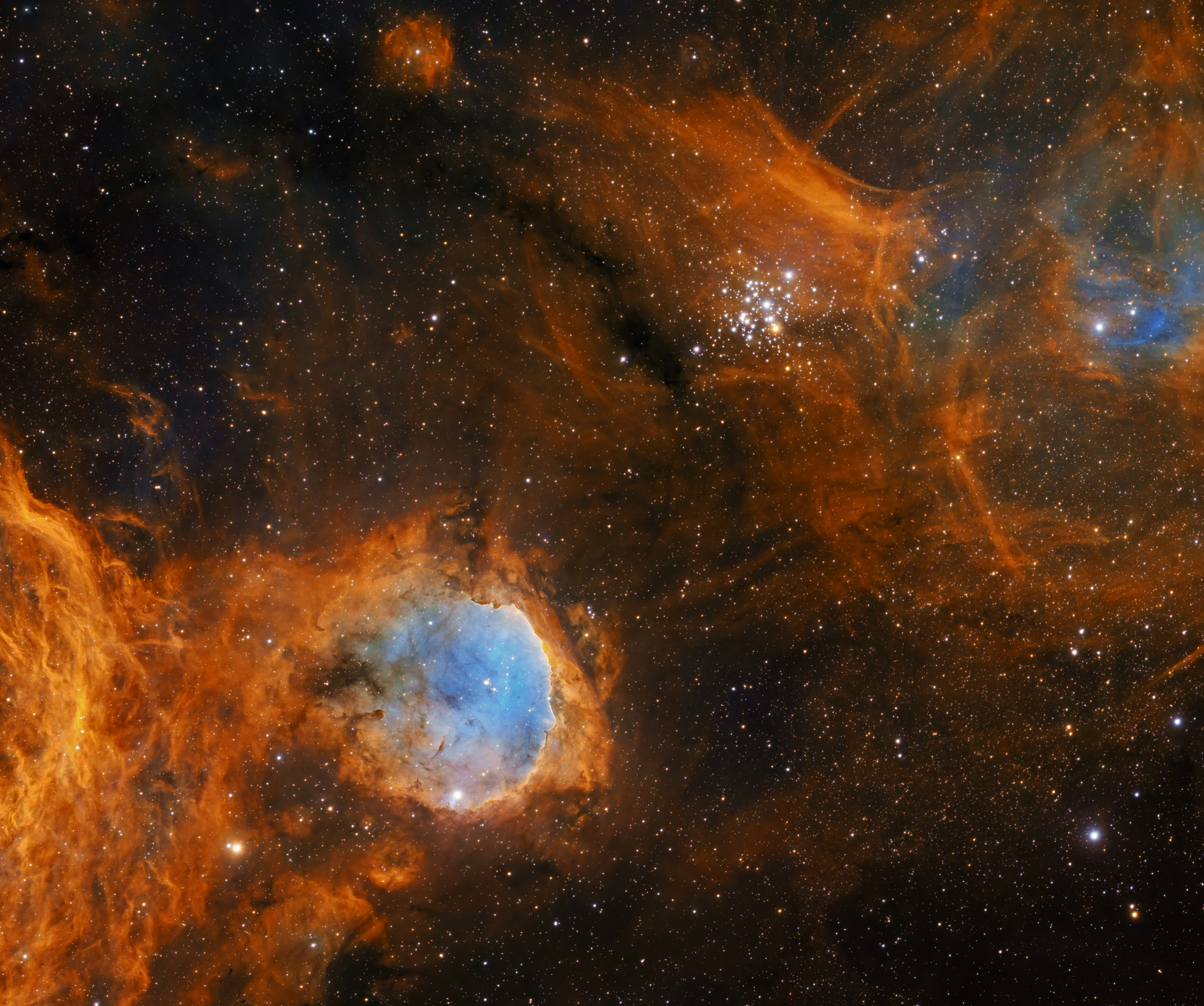 2025.05.24-27 között Namíbiában, az Isabis-völgyben készült felvételem az Hajógerinc (Carina) csillagképben található, IC 2599 katalógusszámú "Gabriela Mistral-ködről". A felvételen látható még a ködösség által körülvett NGC 3324 nyílthalmaz és a kép jobb felső sarkában megfigyelhető NGC 3293 nyílthalmaz is. Itthonról nem figyelhető meg, jóval délebbre kell utazni érte. A felvétel készítéséhez keskenysávú szűrőkészletet használtam, a képeket a Hubble-paletta szerint dolgoztam fel.