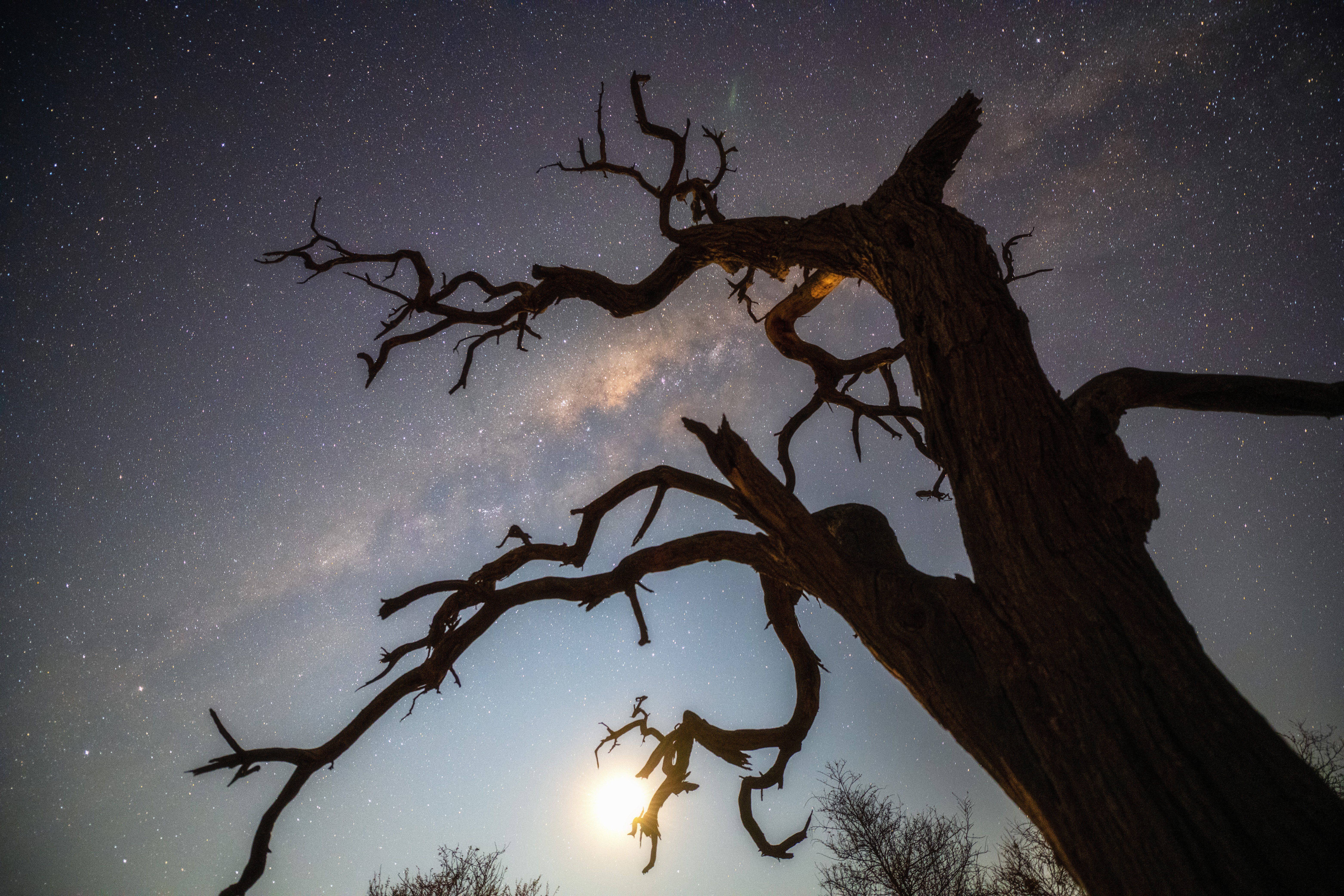 Alapvetően indokolatlanul hanyagolni szoktuk a holdfény mellett történő asztrotájkép fotózást, pedig különösen szépen megtudja festeni a tájat. A kép egy sorozat része (további képek is várhatóak). A fa ismerős lehet már az észlelőrétről, ami nem véletlen, mert Józsival együtt fotóztunk egymás mellől. Meglepő, hogy ilyen erőteljes holdfény mellet is jól látható volt a Tejút. A kép komponálása során hangsúlyt kapott a fa ölelése és a fények.