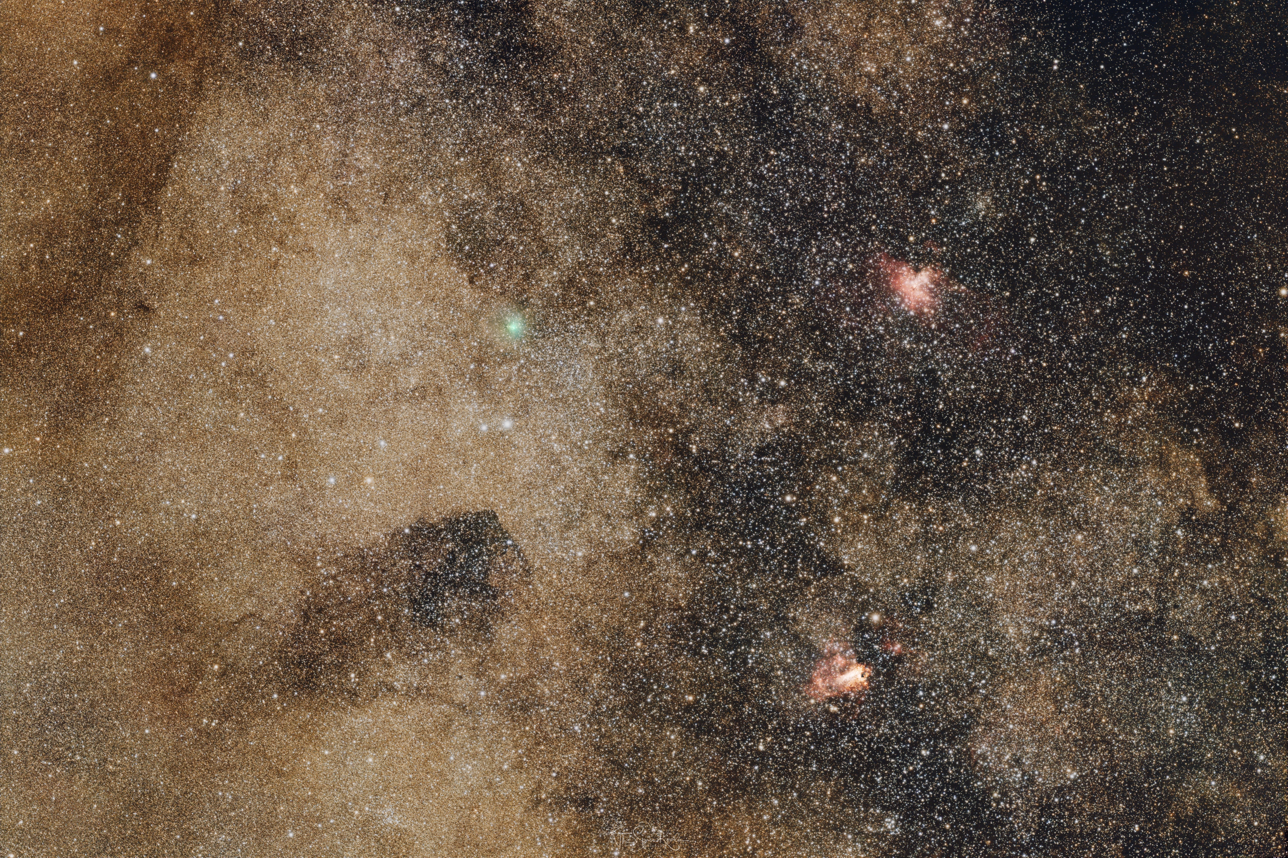 A C/2025 R2 (SWAN) üstökös, amint áthalad a Tejútrendszer sűrű csillagmezején, közvetlenül a Sas-köd és a Hattyú-köd között.