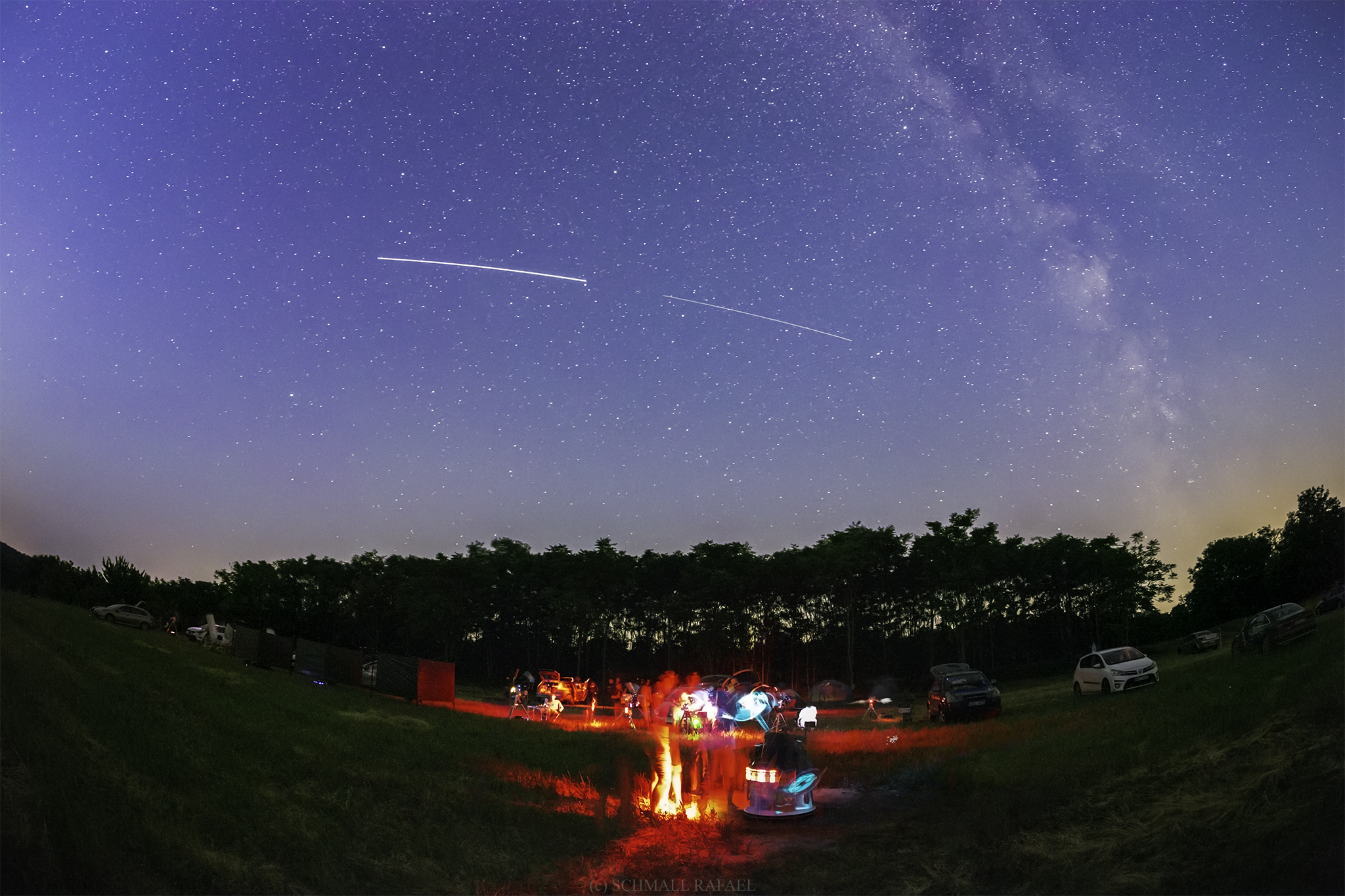 A két mozgó fénypont a 30 másodperces hosszú záridős felvételen szép csíkként látszódik, míg jobboldalon még megfigyelhető a Tejút nyári sávja is. Szép kis kiabálás volt az észlelőréten, ám ez a fajta élmény minden fáradtságot megért. :)