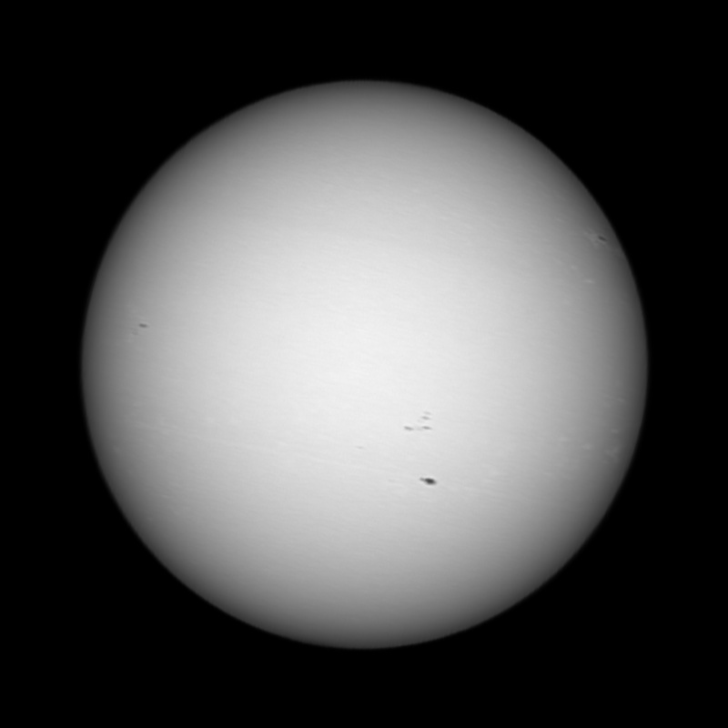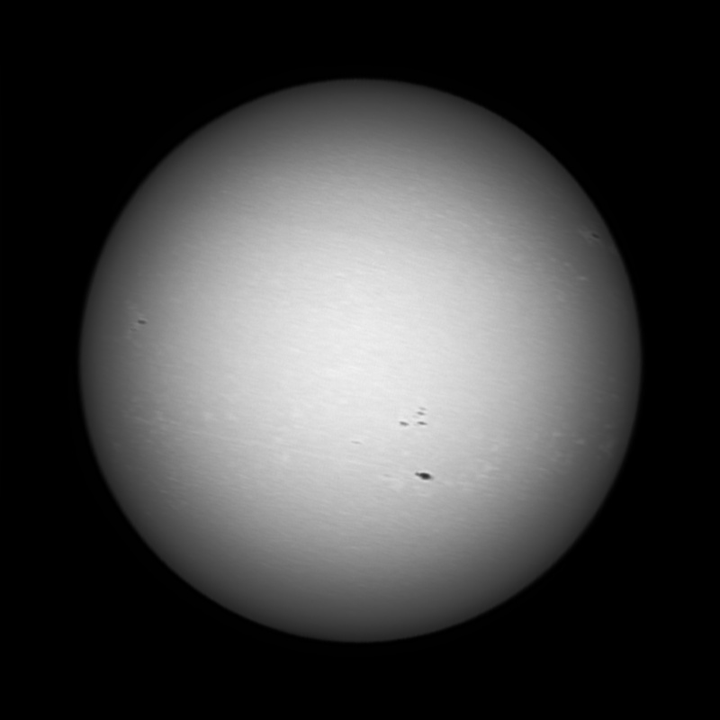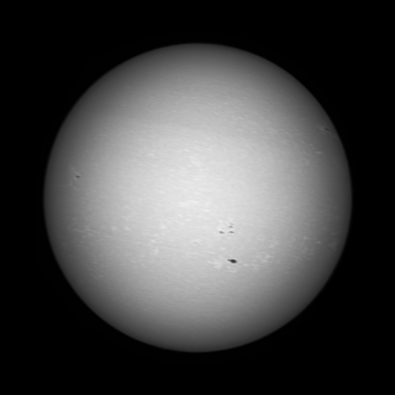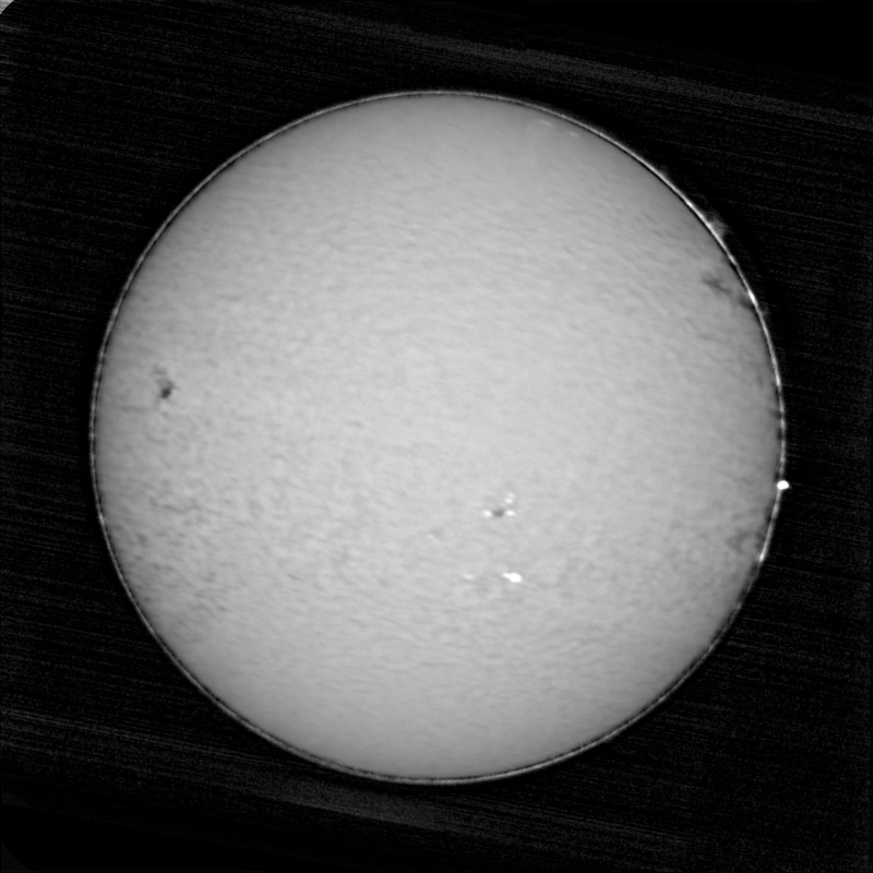 Az O I 7772 vonal jelét erősítettem (túl) ehhez a képhez. Protuberanciák azonnal látszódnak, a korong pedig általában kevésbé kontrasztos, mint a kontinuumban vagy a közeli vasban.