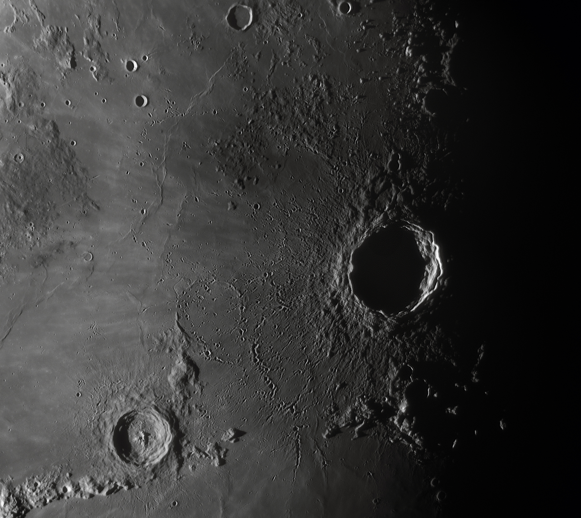 Elfogadható látás volt, így gyorsan kipakoltam és indítottam a videót. A Kopernikusz-kráter pont a terminátor határán egyensúlyozott, így gyönyörű látványt adott. Készítettem 2 panelt és egyesítettem. Az APM 2.67x nyújtónak csak a lencséjét csavartam be a kamera elejébe így a névleges nyújtásnál kisebbet adott. 1 videó 3 perc volt, 133 fps-el, a legjobb 13 % lett felhasználva.