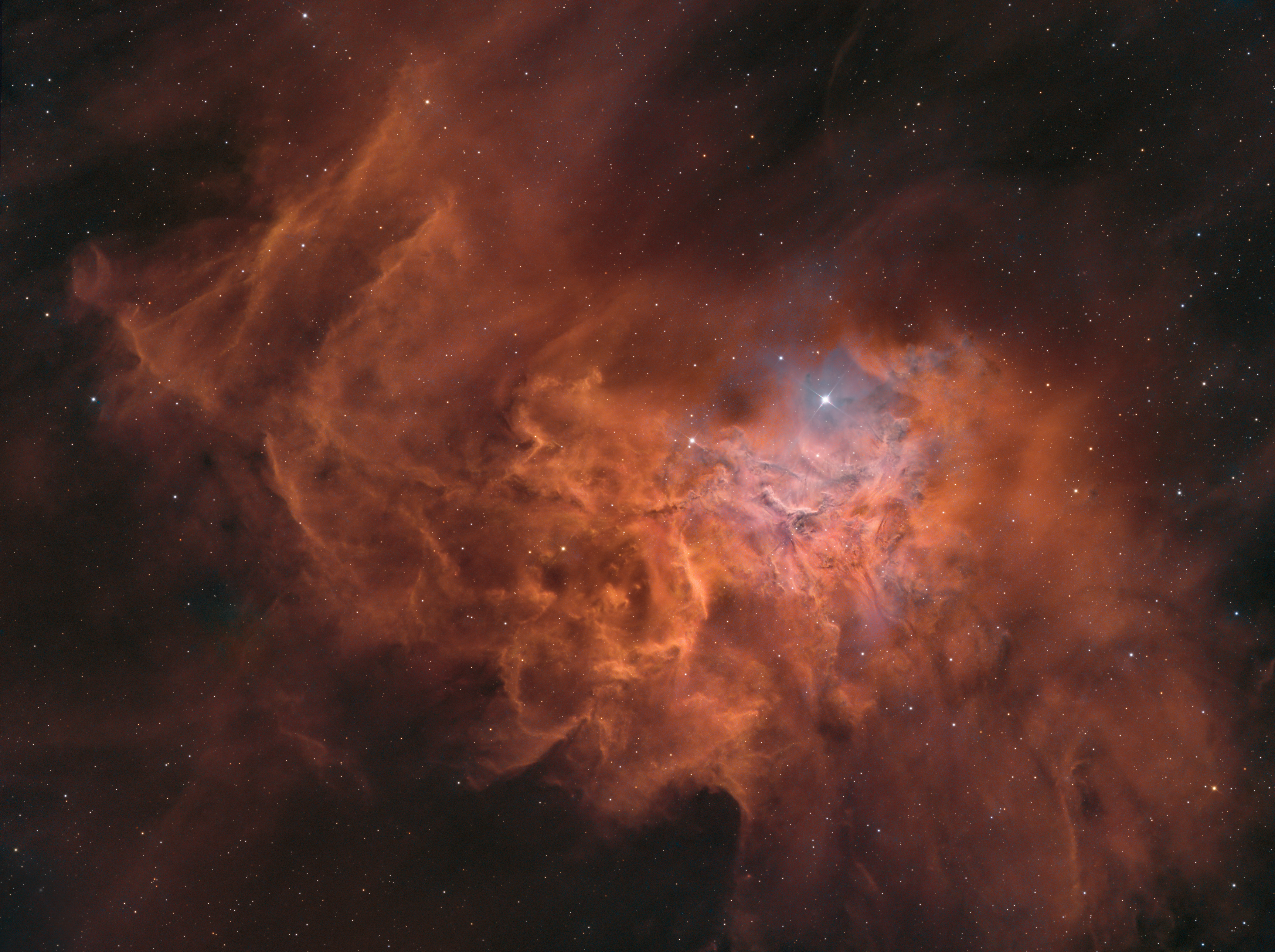 Hozzá merek szolni a témához mert fotóztam ezt már keskenysávba. Nem könnyű objektum. A köd bizonyos részei nagyon halványak. Az artifaktok itt egyértelműen az oiii ból jönek. Úgy kellene a 3 keskenysáv csatornát össze mixelni, hogy ehez képest vissza fogod az oiii at. Erre több megoldás van pl pixelmatek. Tudom nem könnyű mert szeretnénk látni a reflexiós részt is minnél jobban viszont az is túl sok itt a valósághoz képest szerintem.