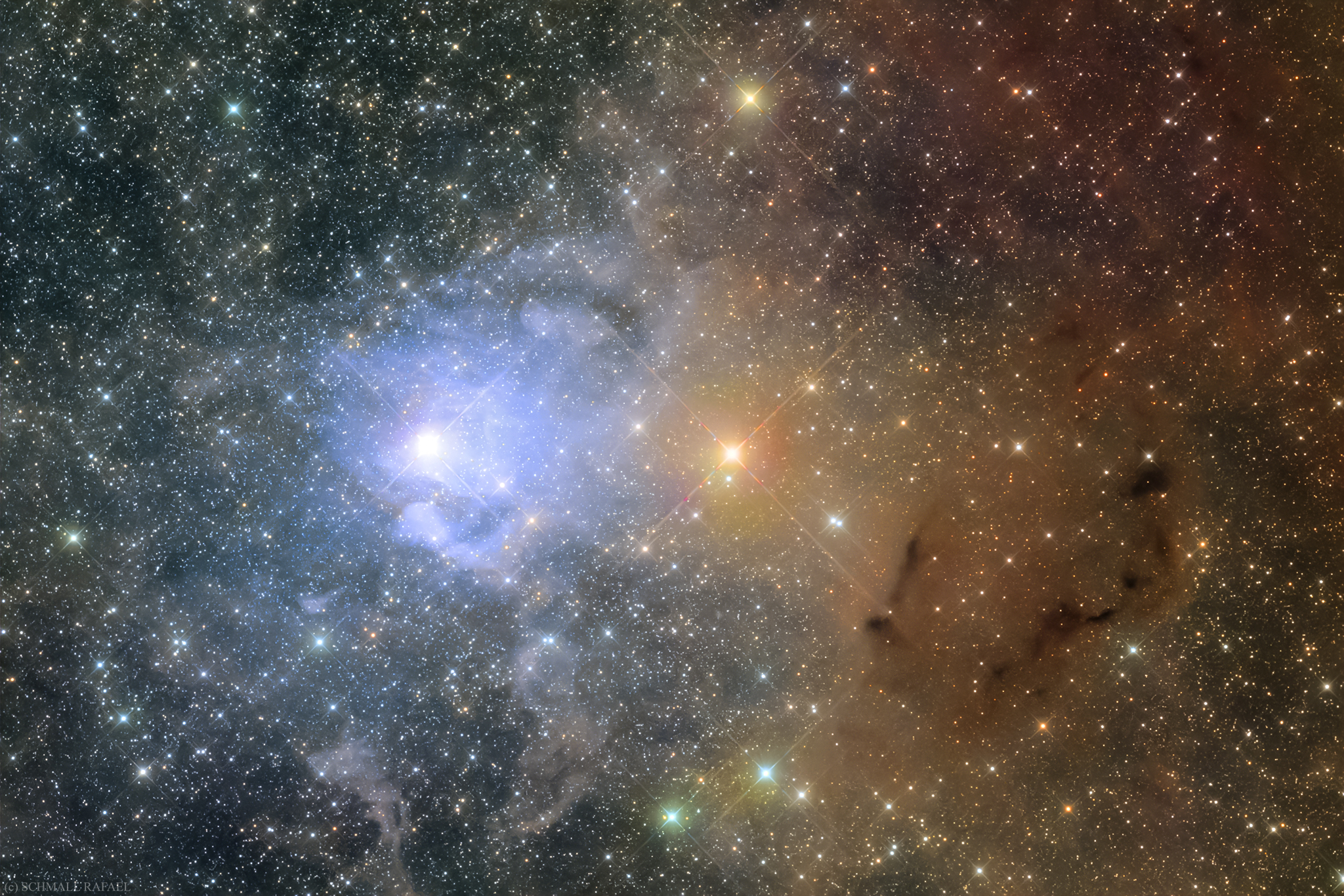 A vdB szépségét a két különböző színű csillag, és a porfelhőn szintén különböző színű reflexió adja. A molekuláris felhő egyre ritkul abban az irányban és már csak fátylak maradnak a kék csillag fele.