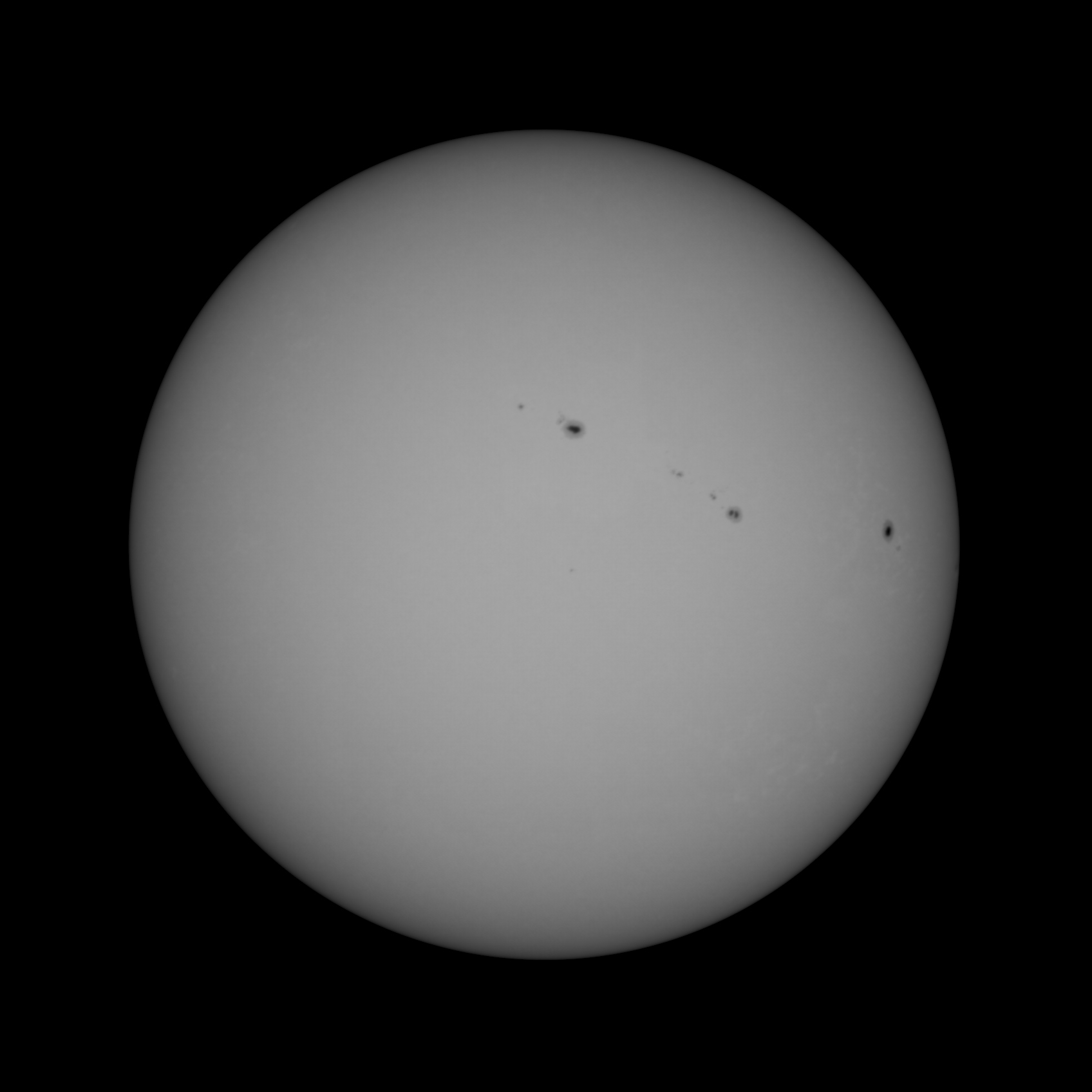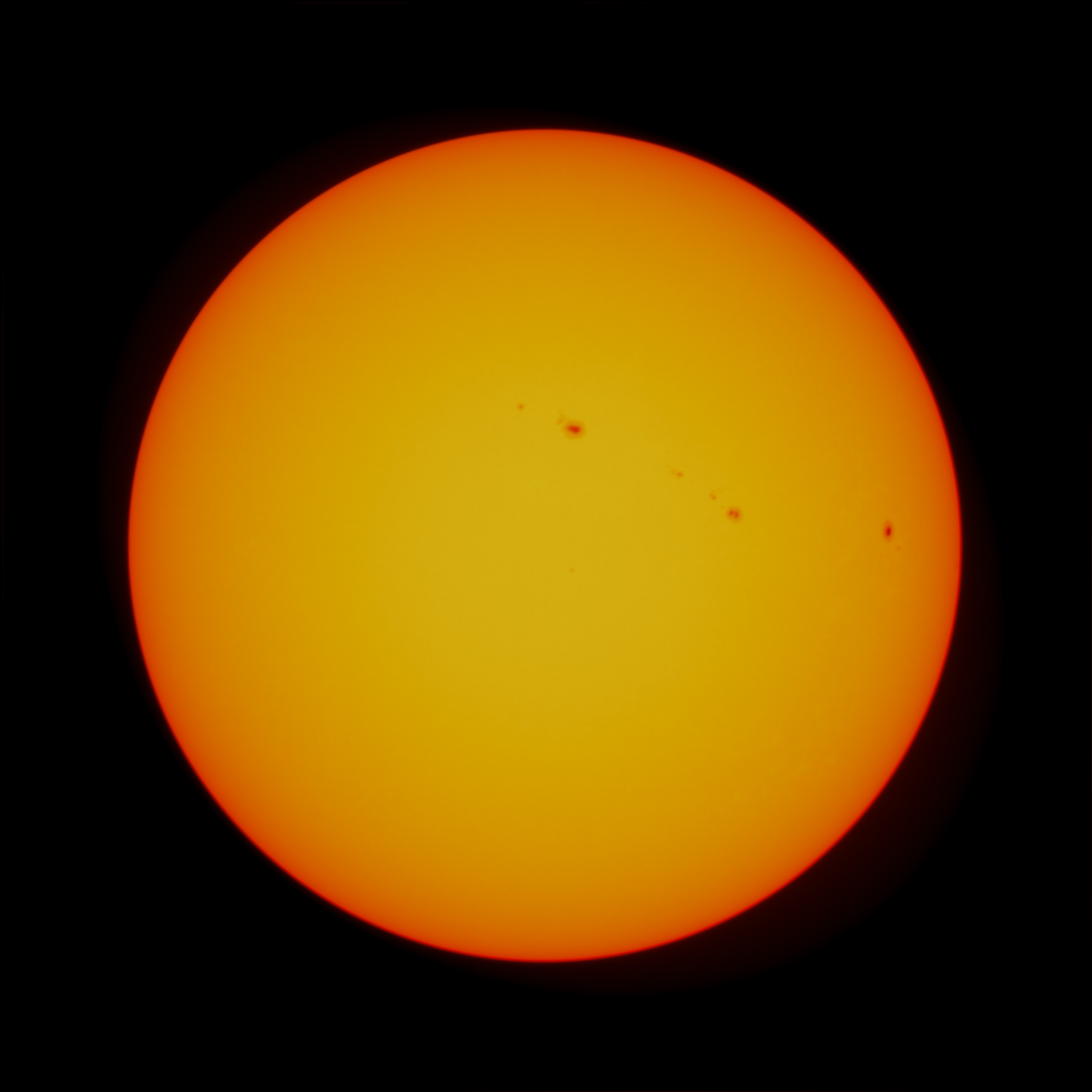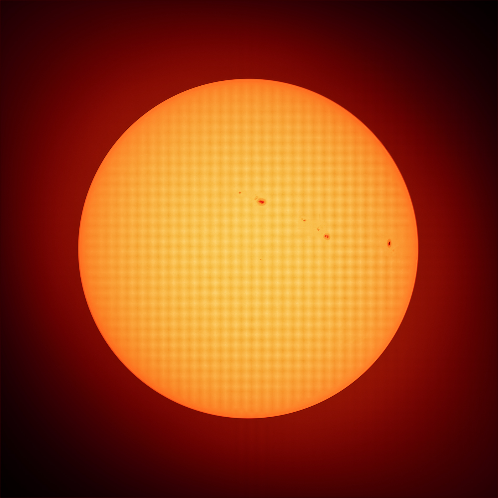 A szombati derült eget kihasználva a napot vettem célba. Három sorozatot készítettem ebből megpróbáltam a legjobbat kiválasztani és azt kidolgozni. A napfoltok vizuálisan is szépen látszódtak. A kidolgozás folyamán nem volt referenciám, hogy milyen programokkal és milyen sorrendben érdemes nekilátni így a holdnál már kipróbáltakat alkalmaztam. Az előfeldolgozás PIPP és Autostakkert valamint a RegiStax programokkal készült és itt végeztem az élesítést is. A végső feldolgozás Photoshopban történt.