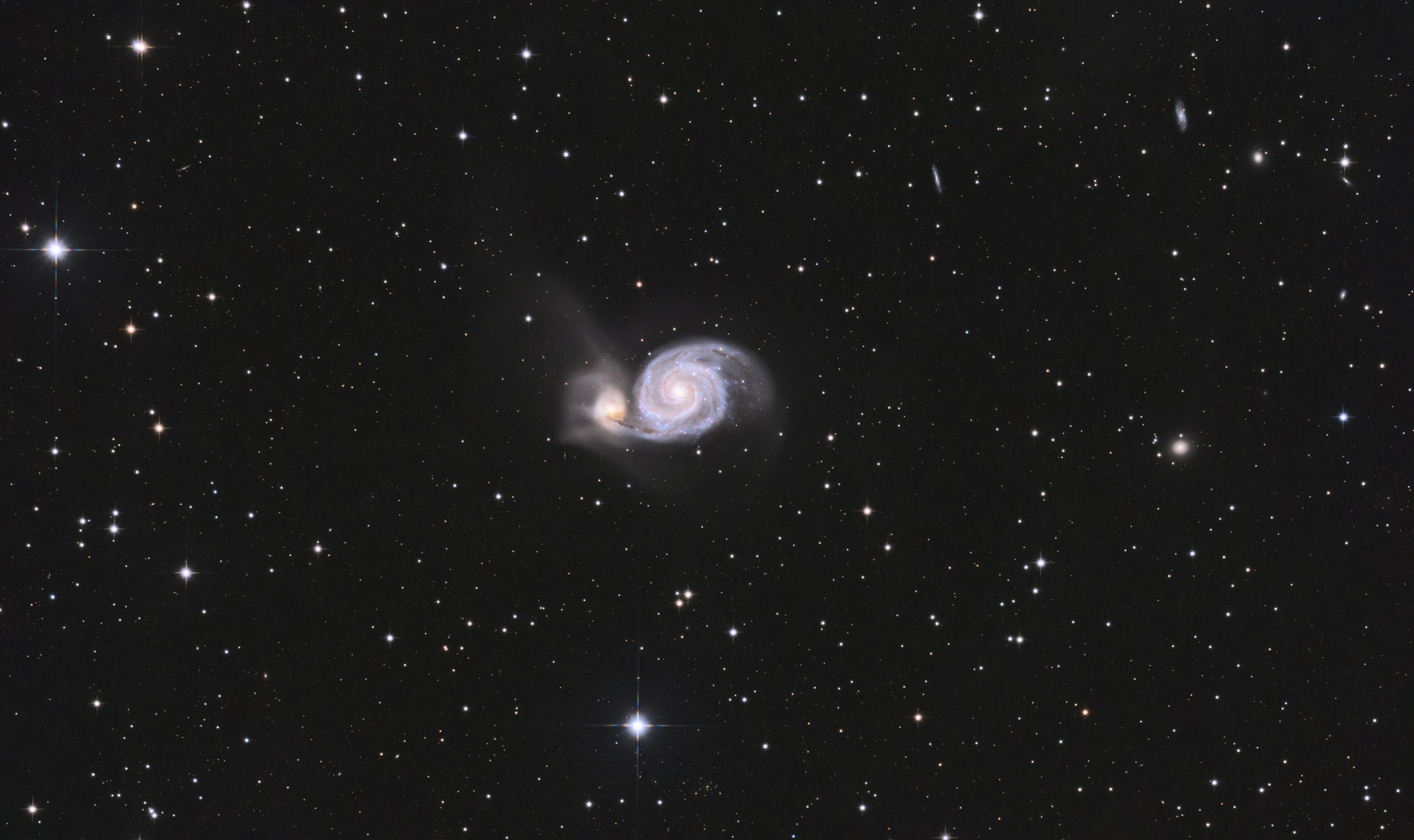 A márciusi derült éjszakákat kihasználva fotóztam az M 51-t. Igazi kihívás volt mert igazán tiszta derült ég egyik éjszaka sem állt rendelkezésre. A szél és a felhőátvonulások miatt a nyersanyag jelentős részét ki kellett dobni.