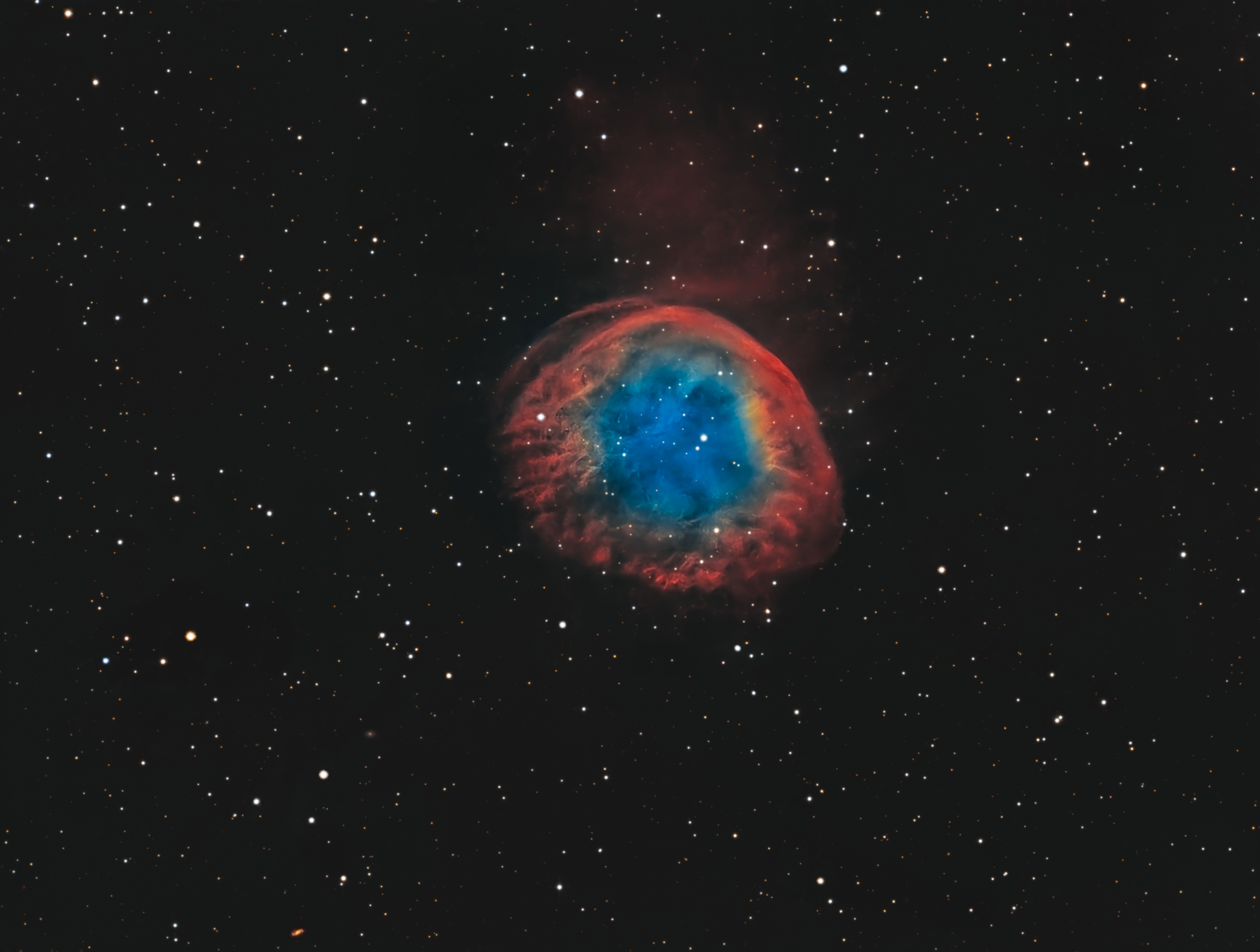 Ez is egy küzdelmes kép lett valahogy. Végre derült éjszakák, de felhőátvonulások, széllökések, köd, pára... sok nyers ment a kukába. Az Sii és az Oiii egy része csak 3 percekkel ment, miután nem volt 5 perc szél nélkül. Nem fotóztam RGB csillagokat, mert a pókláb kajlasága miatt úgyis csúnyák a diffi tüskék. De hamarosan érkezik az új pókláb. Február 25 és március 5 között készült a kép 6 viszonylag tiszta éjszakán.
