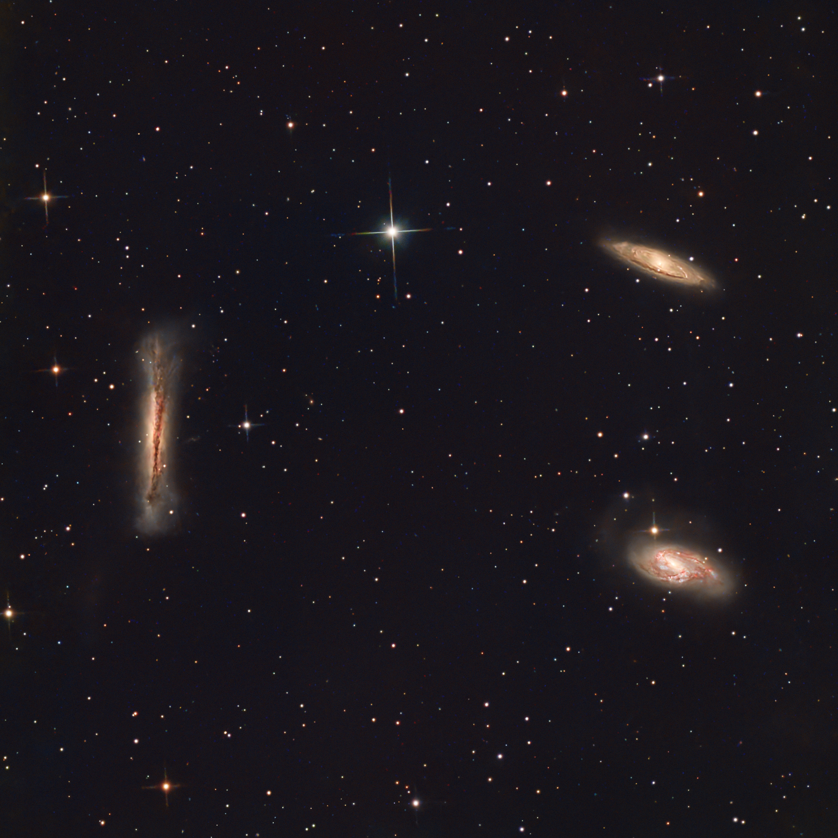 Ha felnézünk az éjszakai égre az Oroszlán csillagkép irányába, szabad szemmel csak sötétséget látunk. De a technika és egy kis kitartás feltárja a valóságot: három hatalmas, spirális galaxist, amelyek egymás körül táncolnak a kozmoszban, kb. 35 millió fényévre tőlünk.