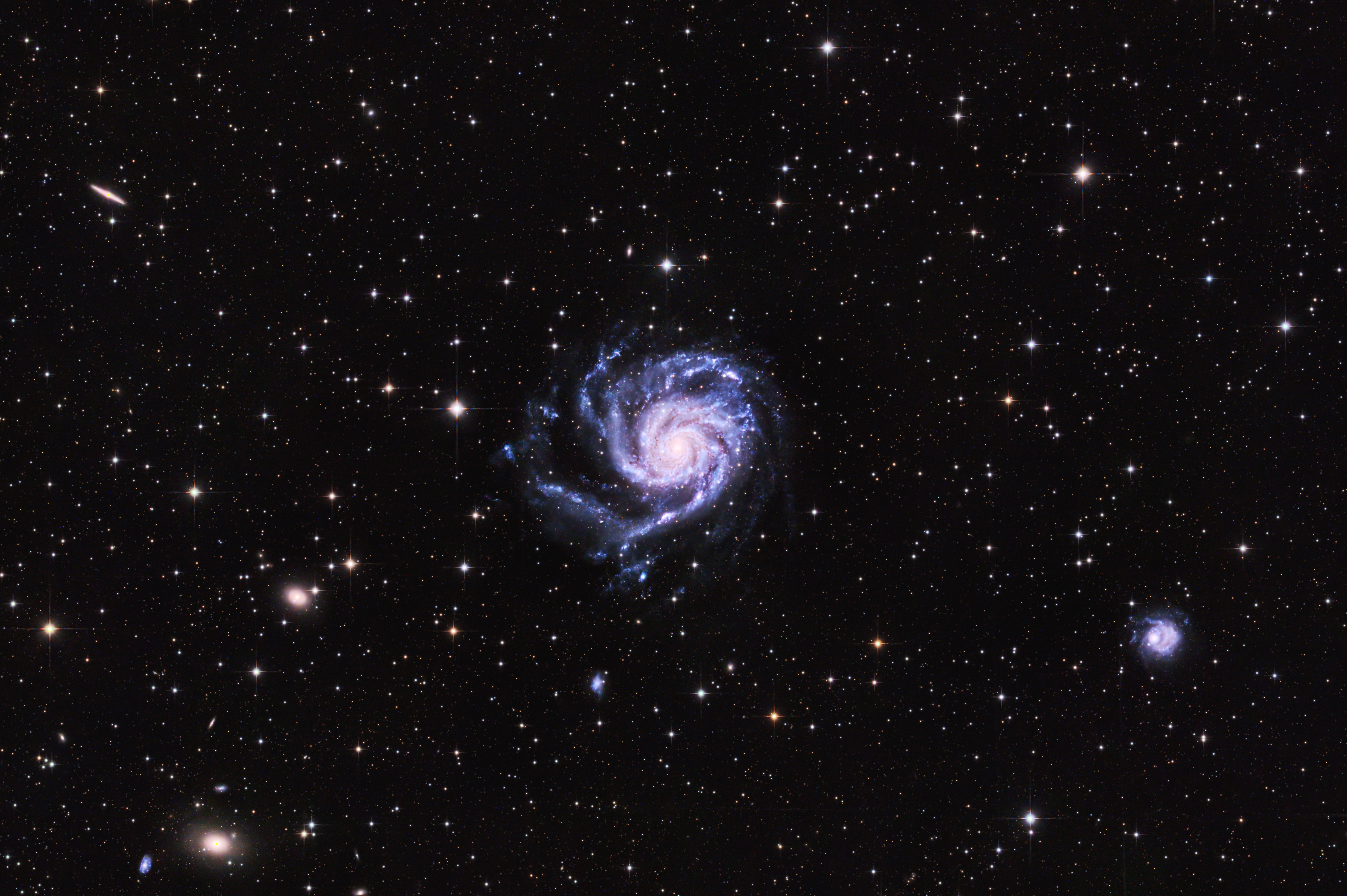 A galaxis szezon egyik kiemelt célpontja a Szélkerék galaxis. A felvétel az OAG tesztelése és beállítása közben készült. Három éjszakát tudtam az objektumra szánni. A kezdeti nehézségek leküzdése után minden gond nélkül működött a rendszer. Csak az átvonuló felhőzet zavart be néha. A feldolgozást a szokásos módon Sirilben és PS-ben végeztem.