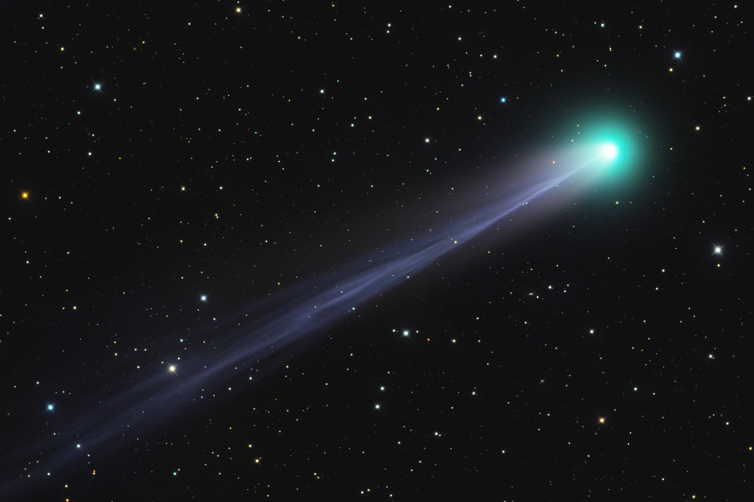 2025. október 2-án az iTelescope-hálózat T26-os távvezérlésű távcsövével örökítettem meg csóvás vándort. Az idei ősz legizgalmasabb kométája már szeptember közepén rendkívül dinamikus csóvaszerkezetet mutatott; több izgalmas csomót és csóvaleszakadást is dokumentáltak. Legutóbbi fotómat épp egy ilyen csóvaszakadást követően készítettem a regenerálódó kométáról, de másfél héttel később, október 2-án már újra egy impozáns üstököst észlelhettem. Az ioncsóva túlzás nélkül percről percre változott, minden eddigi tapasztalatomat be kellett vetnem, hogy visszaadhassam a kométa finom szerkezetét. A feldolgozás rendkívül nagy kihívást jelentett, mégis minden perce inspiráló és tanulságos volt.